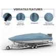 Elevate your boat's safeguarding with our top-tier Ski Boat Cover. Crafted from premium materials - Cover Rite and WeatherMAX 80 - this Cover promises unparalleled durability against UV rays, rain, and the wear and tear of physical damages. Its lightweight design ensures ease in handling, storage, and transport, while the innovative air vents curb condensation buildup. The adjustable straps equipped with push clip buckles deliver a secure fit, complemented by double-stitched reinforcement for added robustness. Not only is this the best Boat Cover for maintaining your ski boat’s pristine condition, but it also comes in various dimensions and vibrant color choices. Customization options including logos and graphics allow you to personalize your cover for a unique look. By choosing our Boat Cover with ski tower compatibility, you extend the lifespan of your vessel significantly - reducing maintenance time. With Custom Boat Covers like ours that cater to every detail, rest assured that both protection and style are guaranteed.