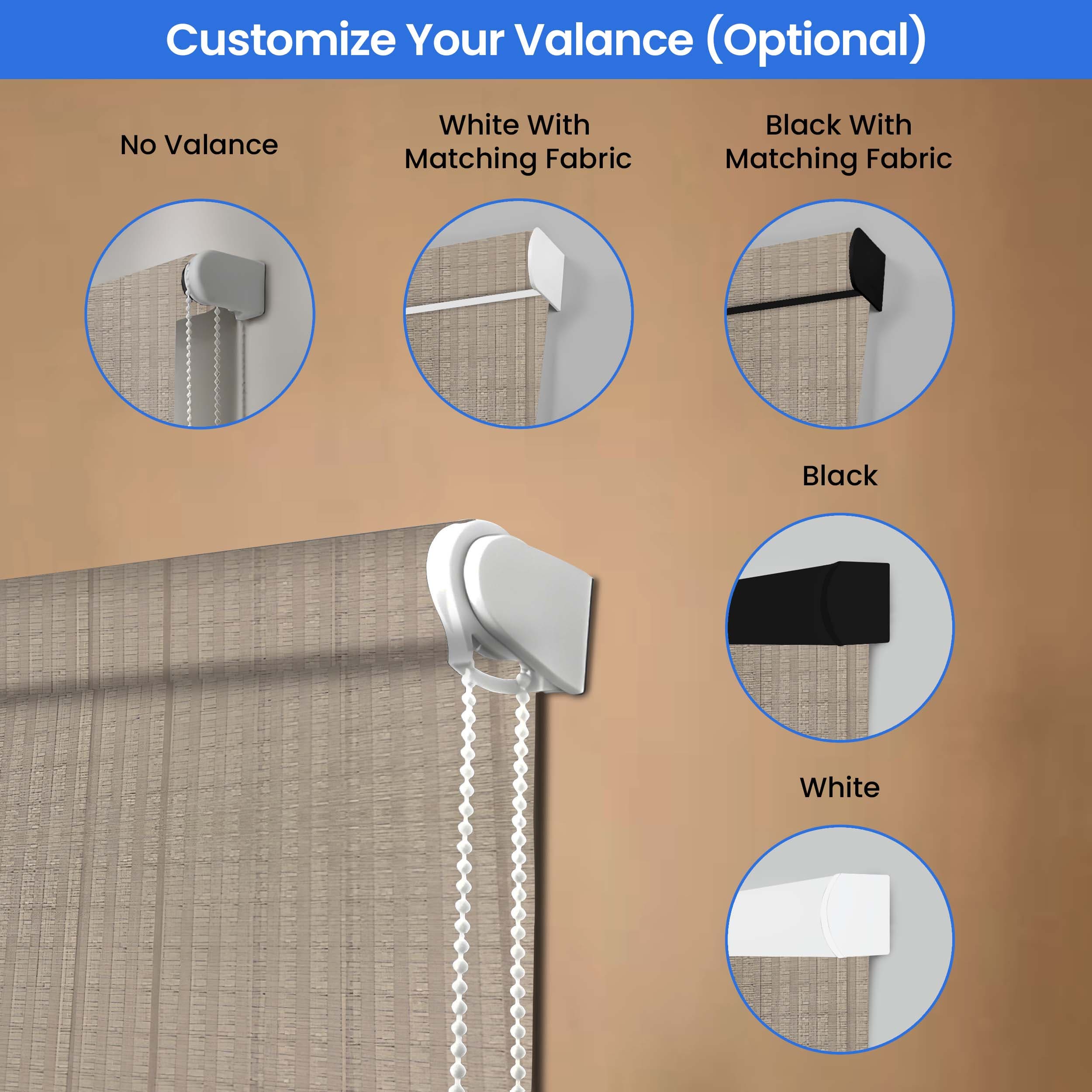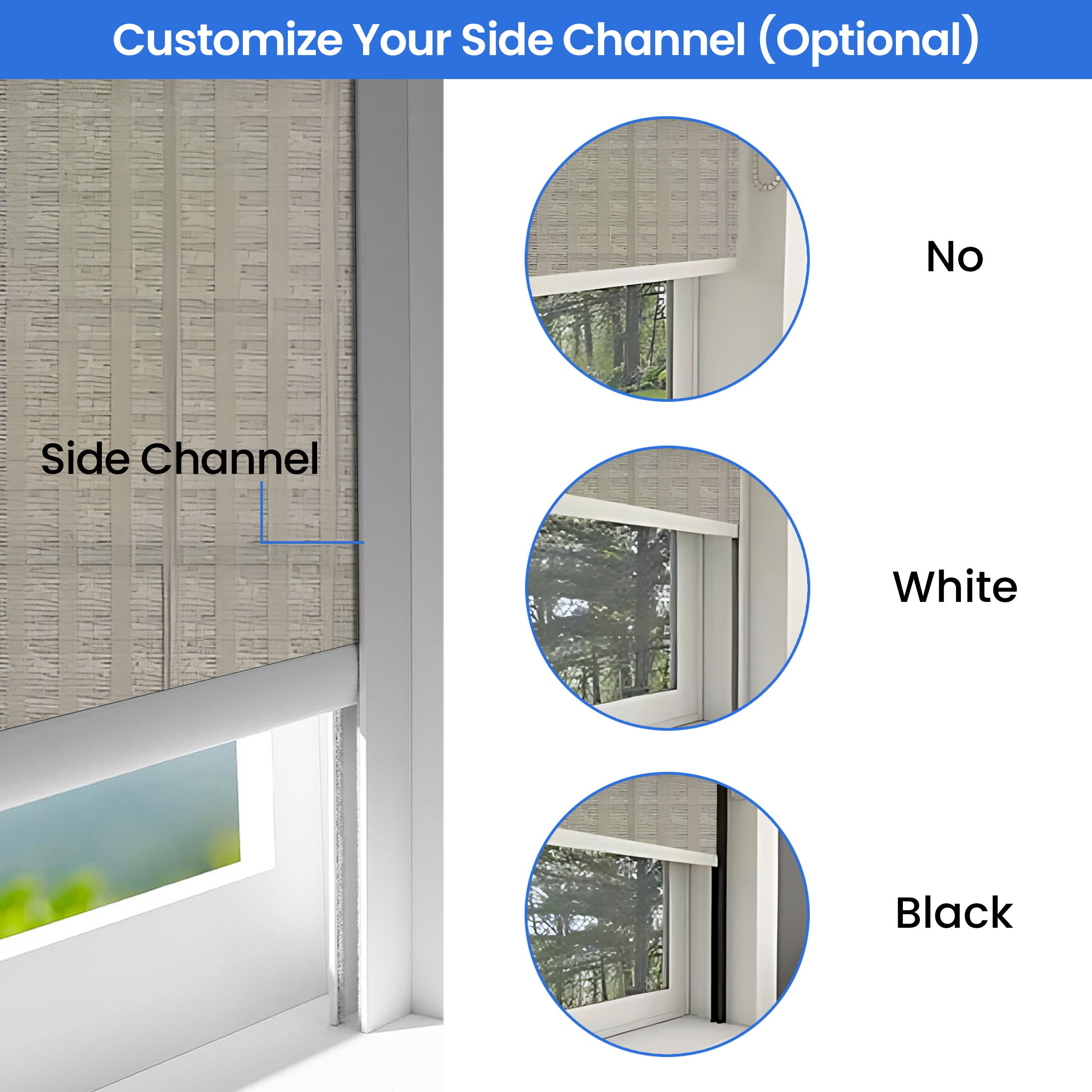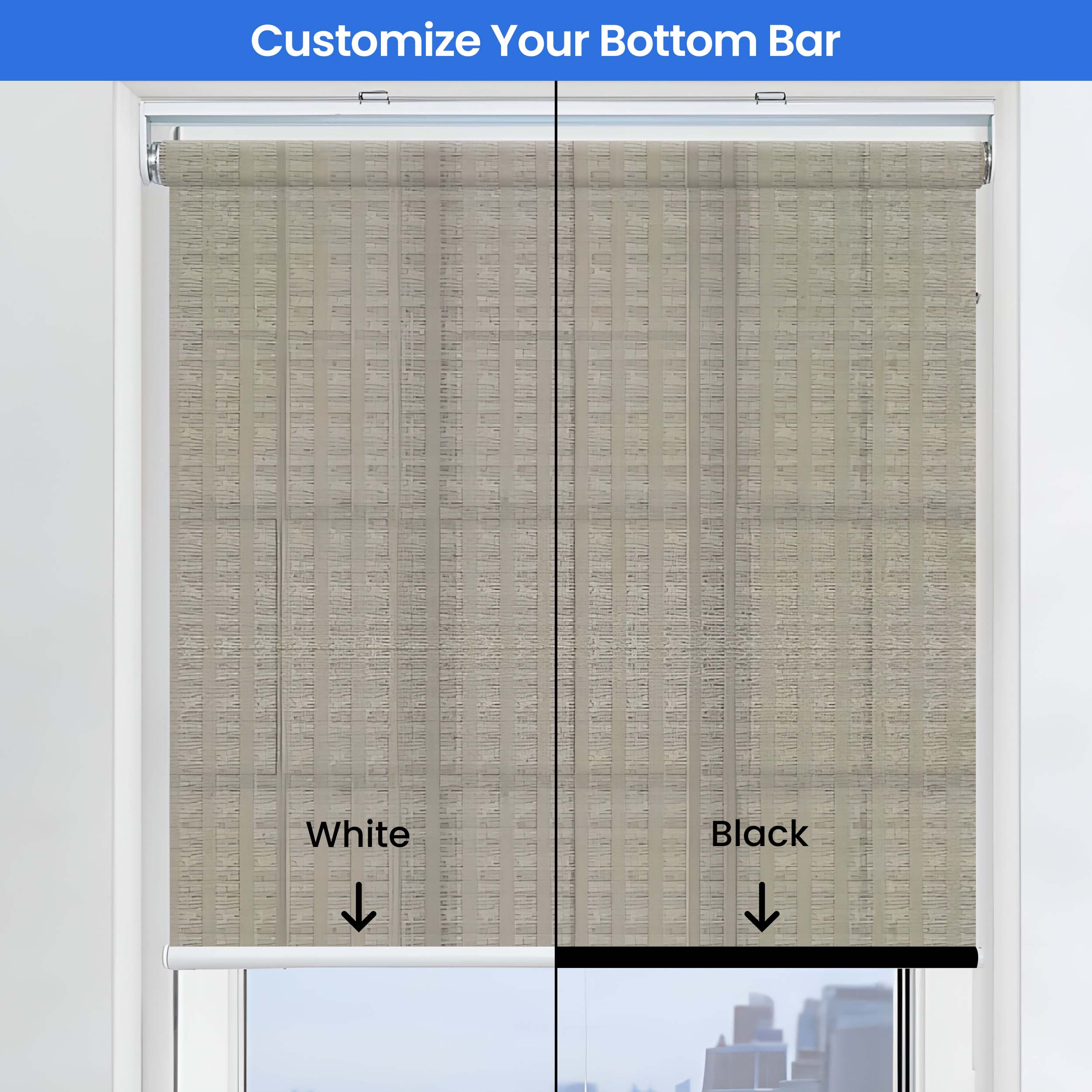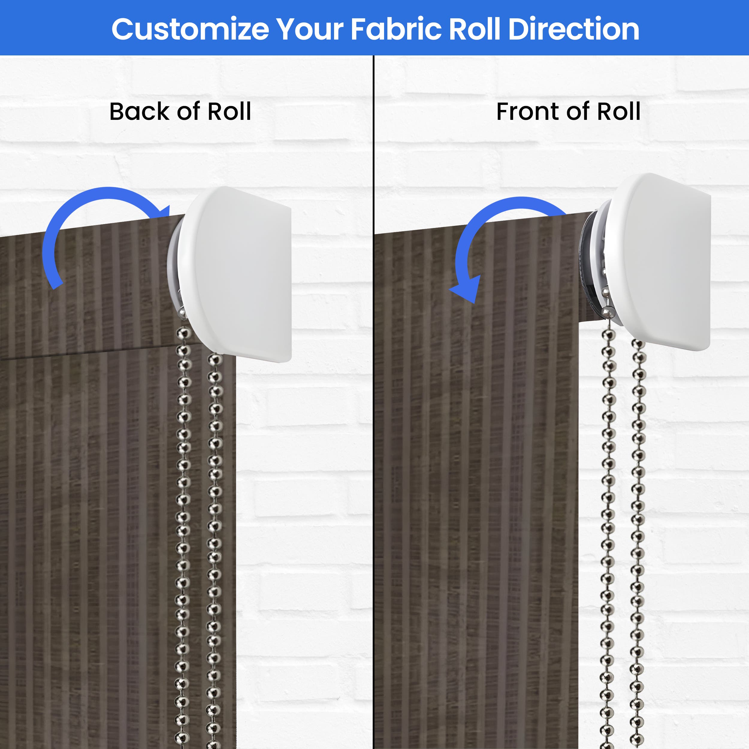 Customise your cordless roller shades for windows with versatile mounting choices - opt for either inside or outside mount installations. Choose your preferred operation style: classic white nylon bead chain, upgraded chrome-finish metal chain, or a convenient motorised system with remote control. Position controls on the left or right side, with fabric rolling from the front or back. Boost functionality with white or black bottom bars and optional matching valances in aluminium construction. Optional side channels achieve total blackout by eliminating light gaps. For lengths exceeding 2.3 m, channels are shipped in two equal sections for easy handling. Our top-quality aluminium components ensure smooth operation and lasting performance.