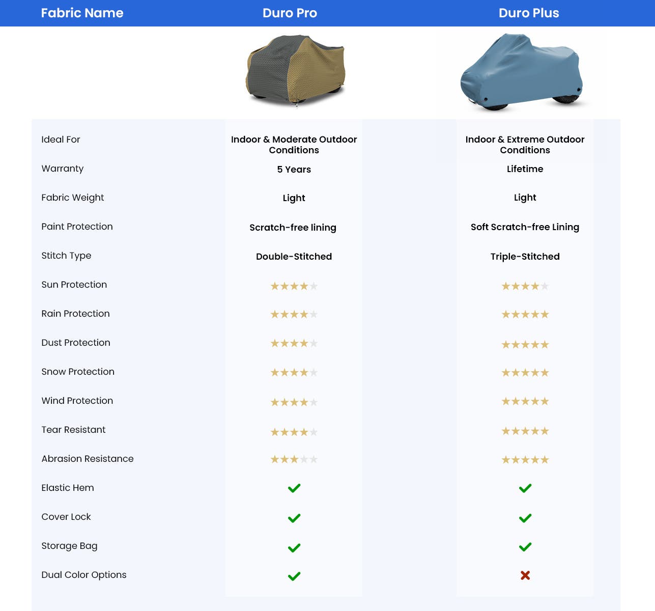 Our made-to-order covers are available with premium double-stitched seams. The double stitch seams not only ensure a great fit with full coverage, but also enhace the durability for long-lasting protection.