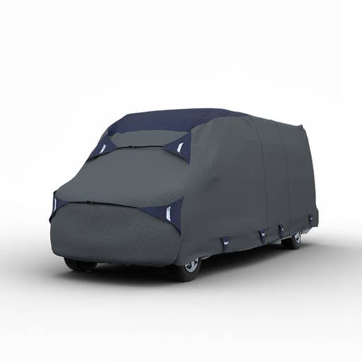 Secure your Class B RV with our high-performance Covers, crafted from premium materials Cover Rite and Duro Pro. Choose the all-Cover Rite version for comprehensive water resistance, or opt for Duro Pro - the hybrid with a Cover Rite top and Duro Pro side panel, blending strength and protection. Designed to enhance airflow, our Covers feature a mesh fabric and a 3" reflective strip to improve visibility and safety. They defend against harsh elements, oxidation, and fading, while preventing mold and mildew, thereby reducing maintenance efforts. Our Custom Covers also shield your RV's interior from sun damage, preserving its value and appearance. Tailored for a perfect fit, our Covers include a free storage bag, patch kit, and optional ladder cap. The adjustable tension panels and robust straps ensure a secure setup. Customize your Cover with choices in size, color, and logos, adapting to your unique style and needs, making it an essential for any RV owner.